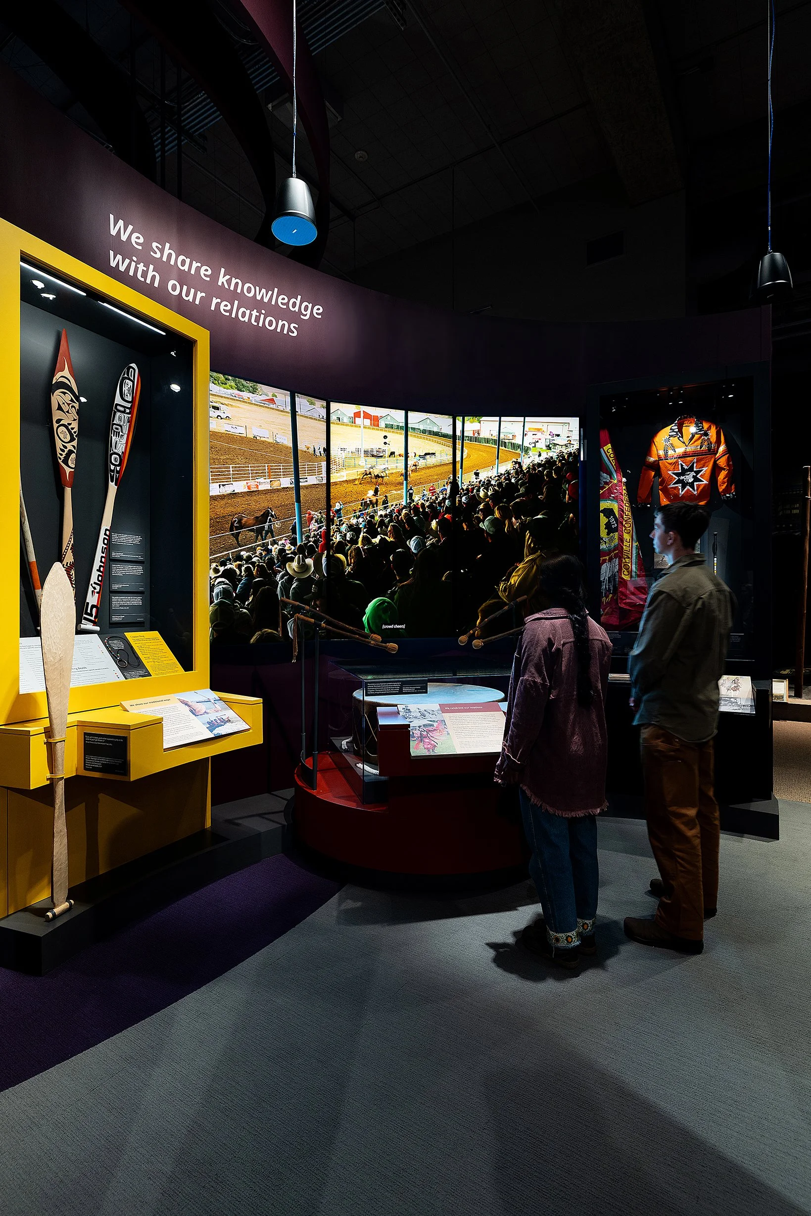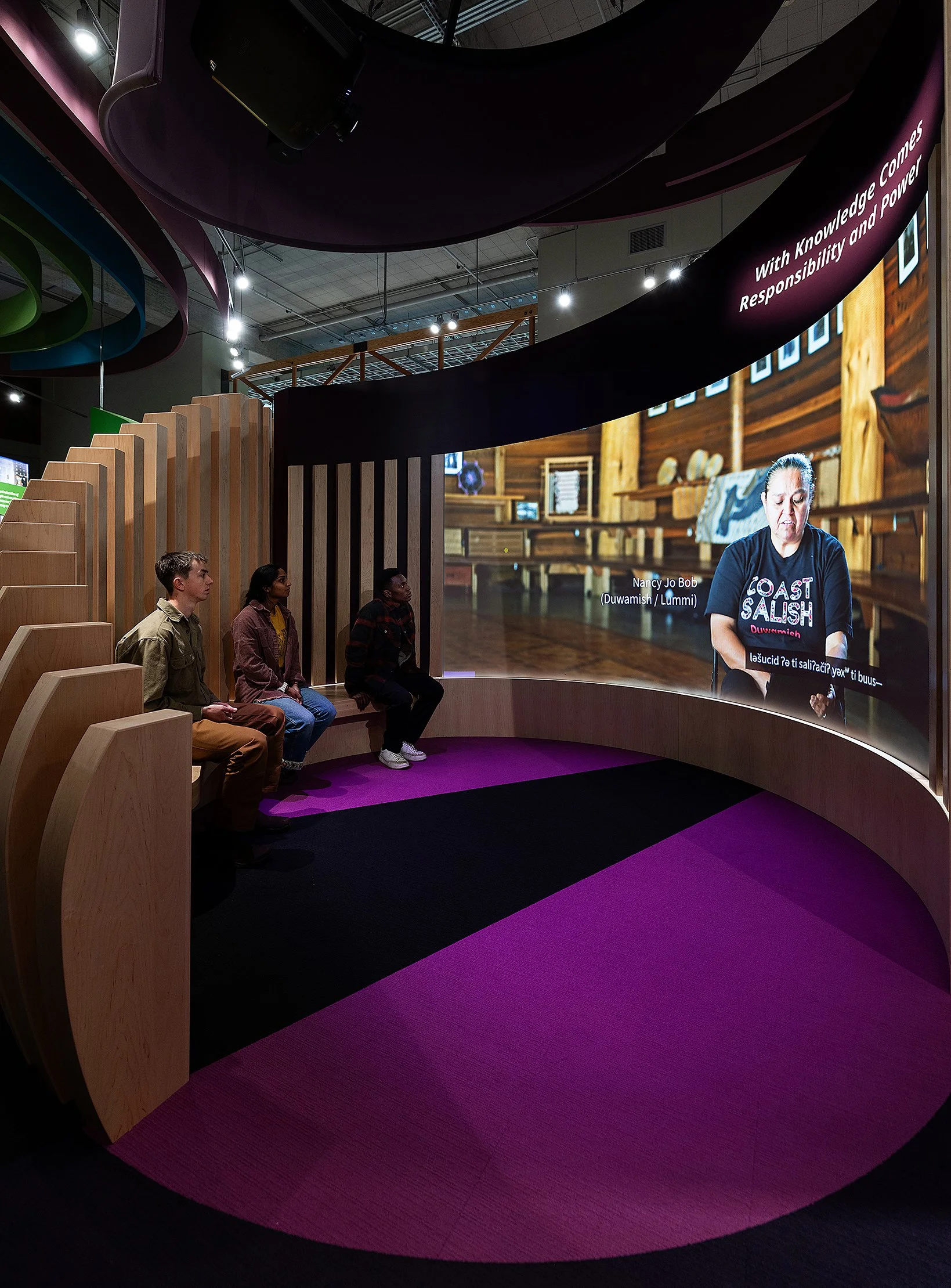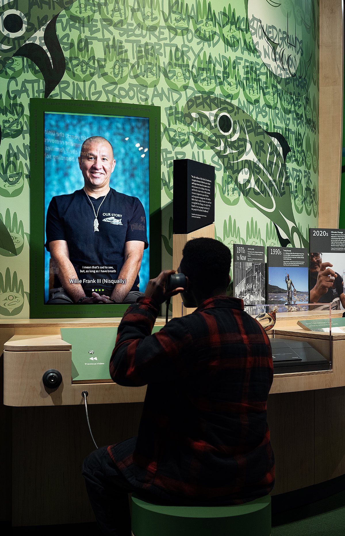 Our scope for this project included researching and filming nine profiles of prominent Indigenous thinkers and activists across Washington for a series of large-scale Core Teaching films. These films explore contemporary issues of sovereignty, land and waters, and the stewarding and passing on of knowledge. Other exhibits explore the intimate relationship between Native languages and landscapes, the legacy of the Fish Wars, the value of traditional foods, intertribal gatherings, and the many treaties that were signed between the US and tribes in what is now Washington State.